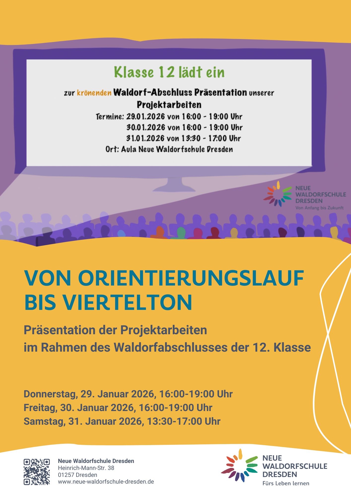 Wir laden Sie herzlichst zu den Präsentationen der Projektarbeiten der 12. Klassen vom 29.–31.01.2026 in den Saal der Neuen Waldorfschule ein.